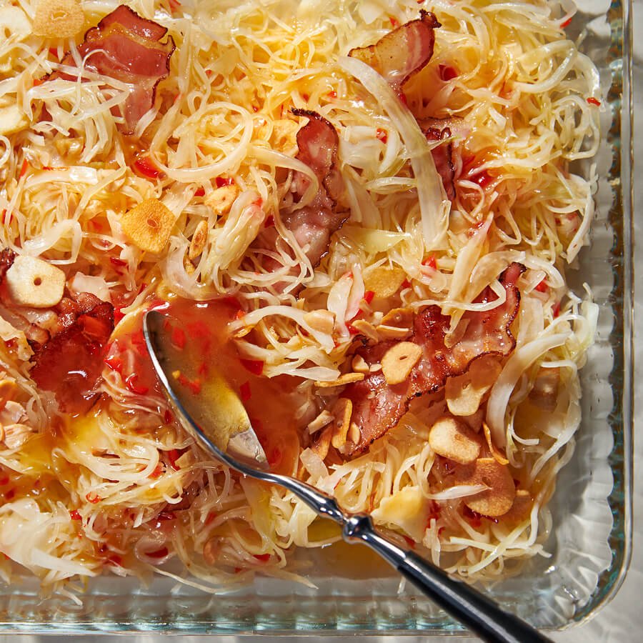 Den Krautsalat mit den Speckstücken, Knoblauchscheiben und Erdnüssen bestreuen.
